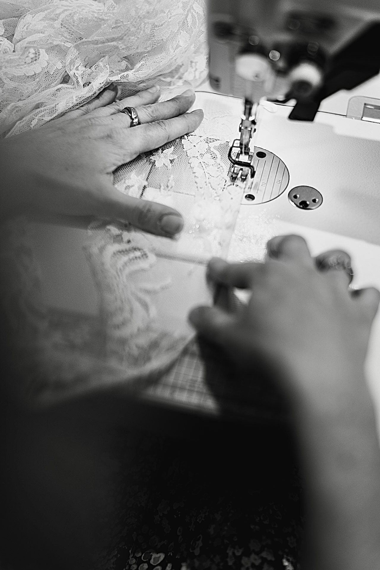 Le choix des matières constitue le fondement de chaque modèle. Nous travaillons exclusivement des tissus d’exception : la dentelle de Calais et ses motifs délicats, la soie et sa fluidité incomparable, le crêpe de soie pour son tombé parfait, l’organza pour sa légèreté aérienne.